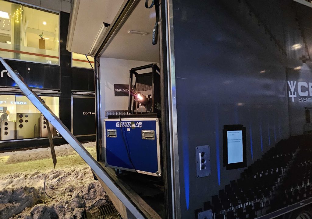 Platsen var ena Hötorgsskrapan i Stockholm och projektorn vi använde os av är en Barco UDX-4K32 som är en mycket ljusstark laserprojektor med 4k-upplösning.